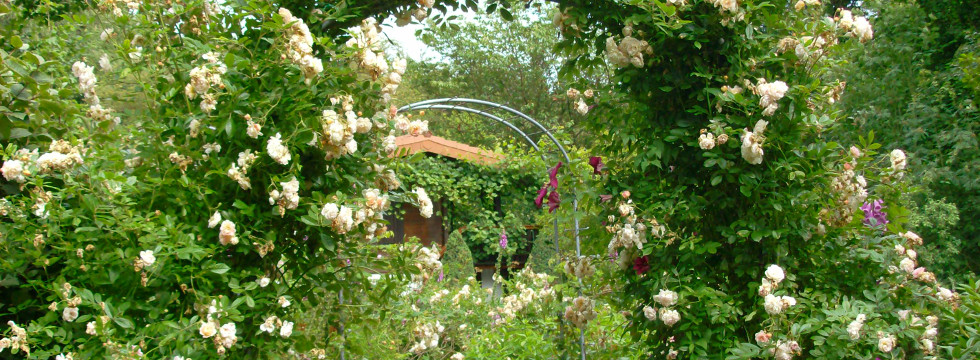 Immer wieder schlendern wir kreuz und quer durch den Garten - auf schattigen Wegen - über sonnige Plätze - ... und durch viele romantische Rosenbögen.