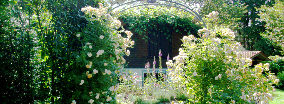 - Von Hecken umgebener parkähnlicher Garten mit altem Baumbestand rund um das Chalet.
