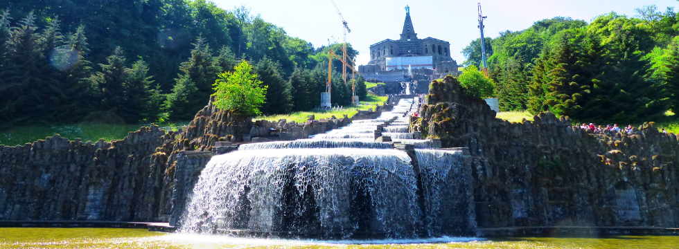 Erst gurgelt und gluckert es nur. Dann läßt das Wasser Fanfaren erschallen bevor es Kaskaden und tosende Wasserfälle flutet und Fontänen speist. 1200 Kubikmeter Wasser durchfließen während der berühmten Wasserspiele im Bergpark Wilhelmshöhe das imposante Wassersystem.