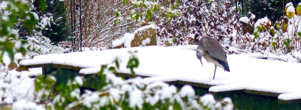 Ein eisiger Wintertag im Chalet-Garten ... und der Graureiher hatte es auf ein leckeres Häppchen aus dem Teich abgesehen.